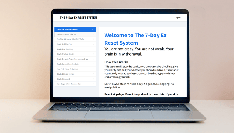 So I built something different. The 7-Day Ex Reset System stabilises you first - kills the checking addiction, gives you clarity, and regulates your nervous system. Only then does it give you the exact scripts for your specific breakup type.